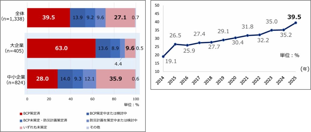 東京商工会議所は、2025年5月18日付けで、災害・リスク対策委員会において、会員企業におけるBCP(事業継続計画)策定状況や、帰宅困難者対策、行政に望む災害・リスク対策施策等を把握するためアンケートを実施し、調査結果をとりまとめている。その結果、BCP策定率は39.5%(企業規模別では、大企業63.0%、中小企業28.0%)。防災計画・BCPいずれも未策定の中小企業は35.9%にのぼる(図1)。BCP策定の課題では、「人員や時間に余裕がない」を5割以上が挙げている。「備えが必要だと感じるリスク」として最も回答が多かったものは「地震」で、BCP策定企業、BCP・防災計画未策定企業ともに95%を超えている。アンケートでは、最近は災害だけでなく、感染症や社会インフラの老朽化等、リスクが多分野、多方面に渡って顕在化しているため、どのようなリスクに対応すべきか絞り込めず不安であるとの声もあり、2016年より年々BCP策定率は上がっているものの(図2)、企業側の課題は大きい(※7)。